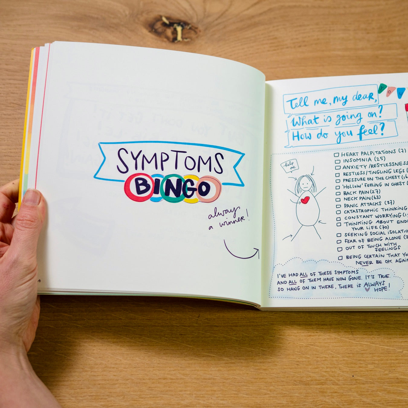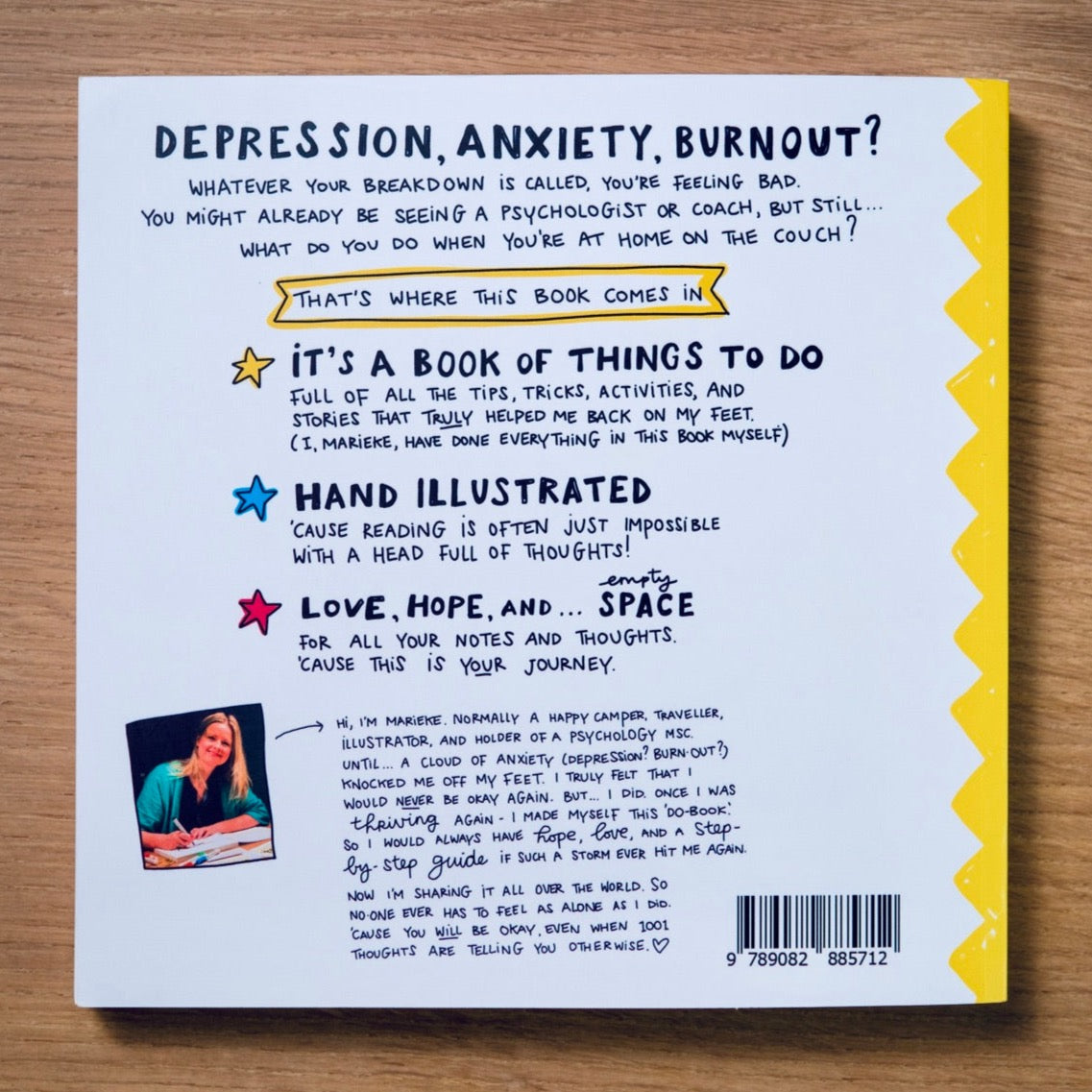 I recently purchased this beautiful self help book....I suffer from severe depression and anxiety.....I was at my lowest point when I saw this fabulous book online....I have bought so many over the years....gave up as found them very patronising....how can anyone understand depression and anxiety and how dehabilitating it makes you.....this book is so so different it's starting to help slowly towards hopefully recovery.....marieke writes this book beautifully and honestly....she has been there herself so knows the struggles we are facing....I couldn't be without my precious book as its so fun to right in and all the funny images....its a really fun book about a serious illness....I can't thank marieke enough for giving me hope for a better life....she has become an inspiration to me
